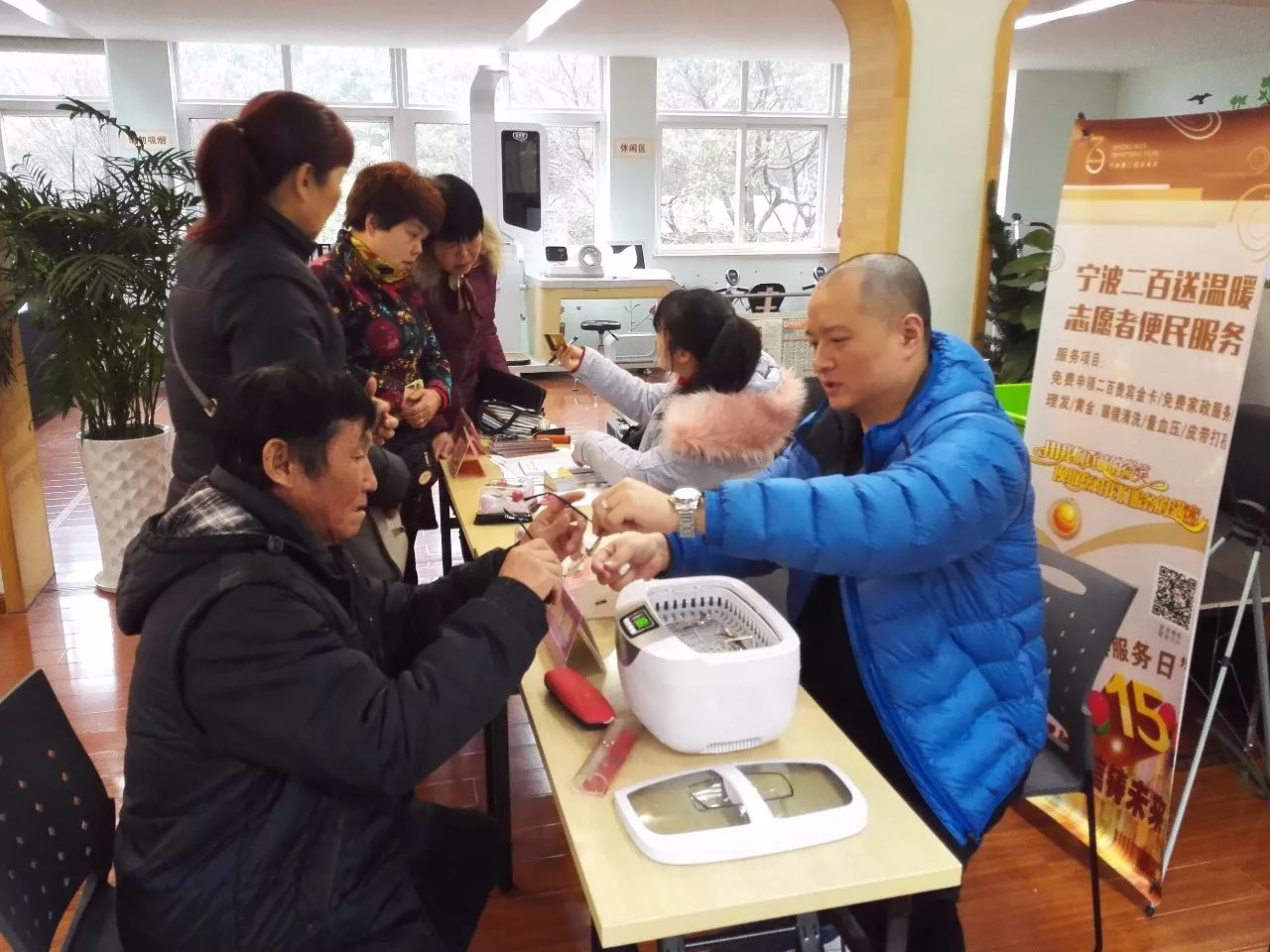 12月28日,一個(gè)陰雨綿綿的日子,冷空氣的到來,使甬城染上了絲絲涼意。這樣的日子里,寧波二百志愿者團(tuán)隊(duì)一大早便驅(qū)車趕往位于鐘公廟街道的鐘盈小區(qū)進(jìn)行便民服務(wù)。盡管天氣欠佳,但志愿者的熱情確絲毫未曾懈怠,到了小區(qū)服務(wù)點(diǎn)之后。看著一群群前來的老年居民,二百志愿者們開啟了忙碌的“行程”。此次二百提供的便民項(xiàng)目主要有:黃金眼鏡清洗、皮帶打孔、血壓測(cè)量、義務(wù)理發(fā)以及貴賓卡免費(fèi)申領(lǐng)。