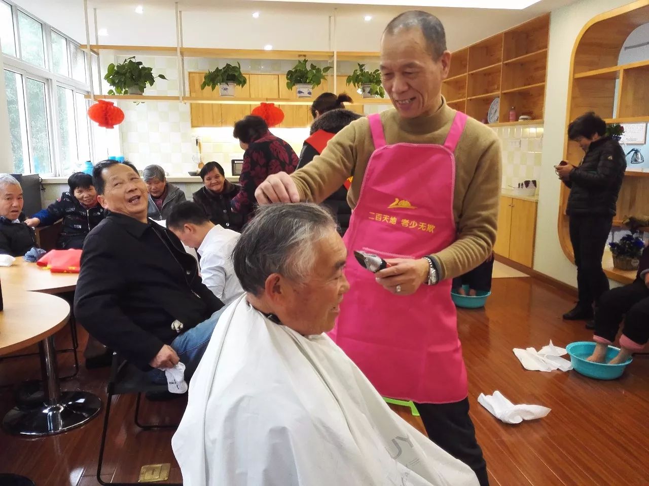 活動(dòng)開始沒幾分鐘,義務(wù)理發(fā)區(qū)就排起了長(zhǎng)長(zhǎng)的隊(duì)伍,二百的專業(yè)理發(fā)人員“朱師傅”一邊仔細(xì)地為每一位老年者理發(fā),一邊同他們聊家常,爽朗的笑聲充斥著整個(gè)大廳。