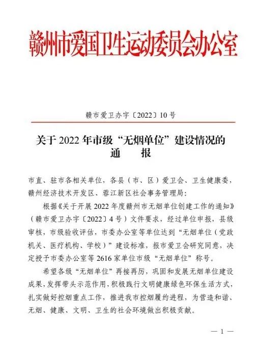 自開展“無煙單位”創(chuàng)建工作以來,集團(tuán)積極貫徹落實(shí)《贛州市控?zé)熜袆?dòng)實(shí)施方案(2020-2030年》(健康贛州辦發(fā)〔2020〕14號(hào))精神,結(jié)合工作實(shí)際,嚴(yán)格對(duì)照無煙單位創(chuàng)建標(biāo)準(zhǔn),通過積極引導(dǎo)、完善制度、健全機(jī)構(gòu)、明確責(zé)任、強(qiáng)化監(jiān)督,促使廣大員工深刻認(rèn)識(shí)到吸煙的危害,集團(tuán)吸煙行為得到了有效控制,控?zé)煿ぷ魅〉昧嗣黠@成效,于2022年5月順利通過了贛州市愛國衛(wèi)生運(yùn)動(dòng)委員會(huì)的檢查驗(yàn)收。