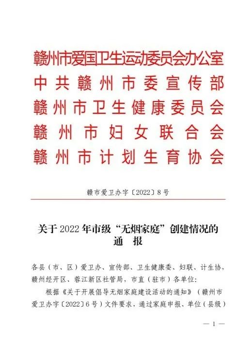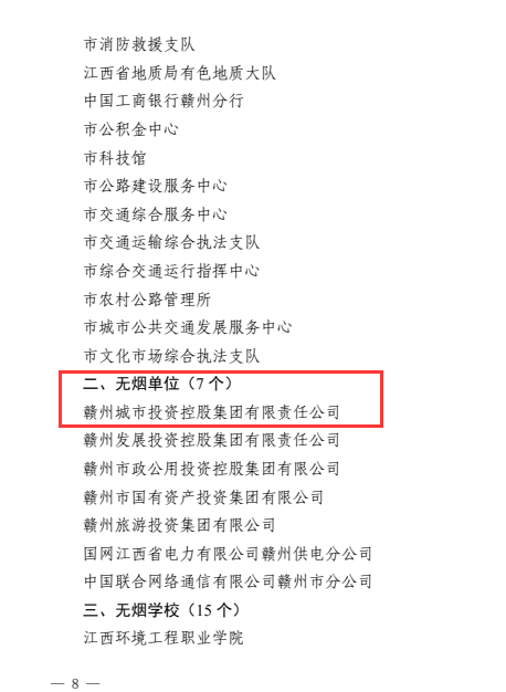 5月31日,在贛州市第35個(gè)世界無煙日“煙草危害環(huán)境”主題宣傳活動(dòng)會(huì)議上,贛州市愛國衛(wèi)生運(yùn)動(dòng)委員會(huì)公布了2022年市級(jí)“無煙單位” 、“無煙家庭”名單。贛州城投集團(tuán)榮獲“市級(jí)無煙單位”榮譽(yù)稱號(hào),五名員工家庭喜獲“無煙家庭”榮譽(yù)稱號(hào)。